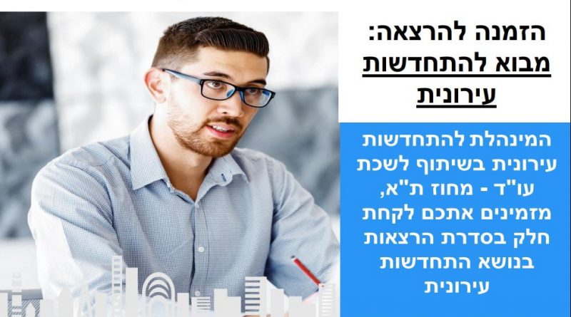 ההרצאה הראשונה בסדרה, מבוא להתחדשות עירונית, תתקיים ביום רביעי השבוע, 19.1.22, בשעה 19:30 בזום ללא תשלום ומותנית בהרשמה מראש- להרשמה לחץ כאן