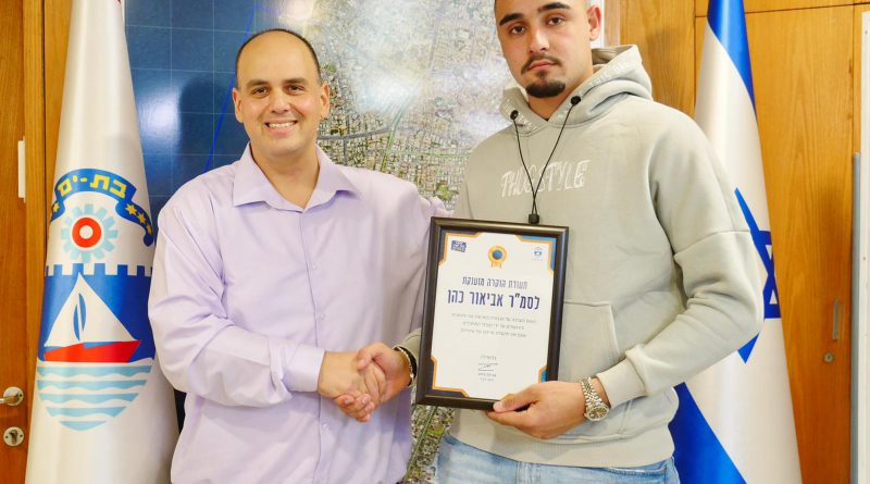 ראש העיר בת-ים צביקה ברוט העניק תעודת הוקרה לסמ"ר אביאור כהן, תושב העיר אשר נטרל פעמיים מחבלים שניסו לבצע פיגועים
